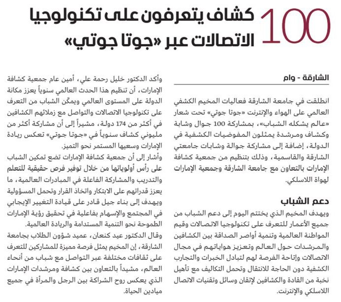 The JOTA-JOTI World Scout Jamboree on the Air and the Internet, hosted by the University of Sharjah from October 17-19, 2025, under the theme “A World Shaped by Youth,” received extensive media coverage from local newspapers.